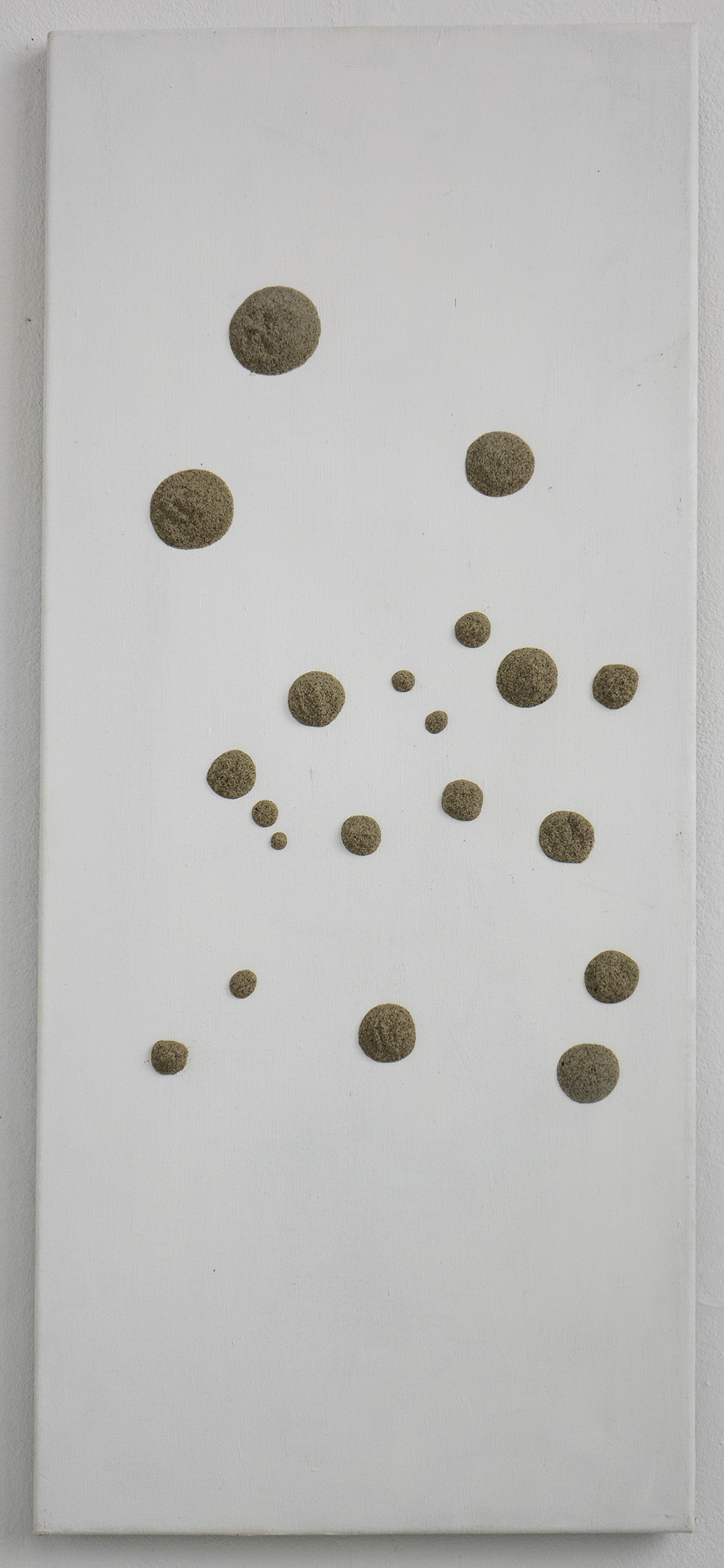 duintoppen die vanuit de Plek te zien zijn zand op linnen en foto van schaduwreliëf rond de Plek 35 x 80 cm